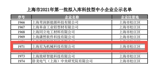 近日,根據(jù)《科技型中小企業(yè)評價辦法》,上海尼為機(jī)械科技有限公司被認(rèn)定為上海市2021年第1批擬入庫科技型中小企業(yè)。這是我司在科技創(chuàng)新型企業(yè)發(fā)展道路上取得的喜人成果,是有關(guān)部門給予我司研發(fā)和創(chuàng)新能力的認(rèn)可。