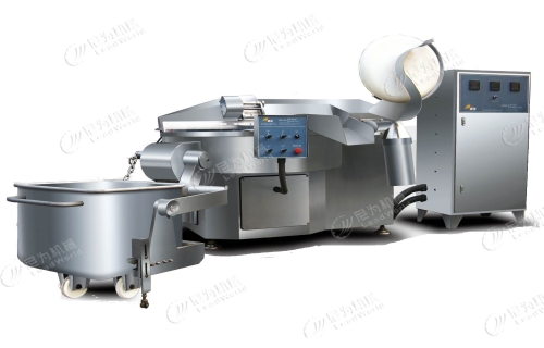 首先,將剔骨處理過的新鮮的牛肉用斬拌機切分成適當大小,清洗后再放入預煮機中燜煮。